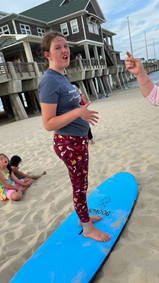Each surfer had one therapist and two advanced surfers paired up with them - knowing how crazy you are in the waves, Daddy and Ms. Caitlin suited up to help just in case 😉. Now, with everyone's best efforts, you found your enjoyment in jumping in the waves. Still, you rode not a surfboard but a bodyboard once, which was a-ok. You had a blast but did more of a hang-two rather than ten.